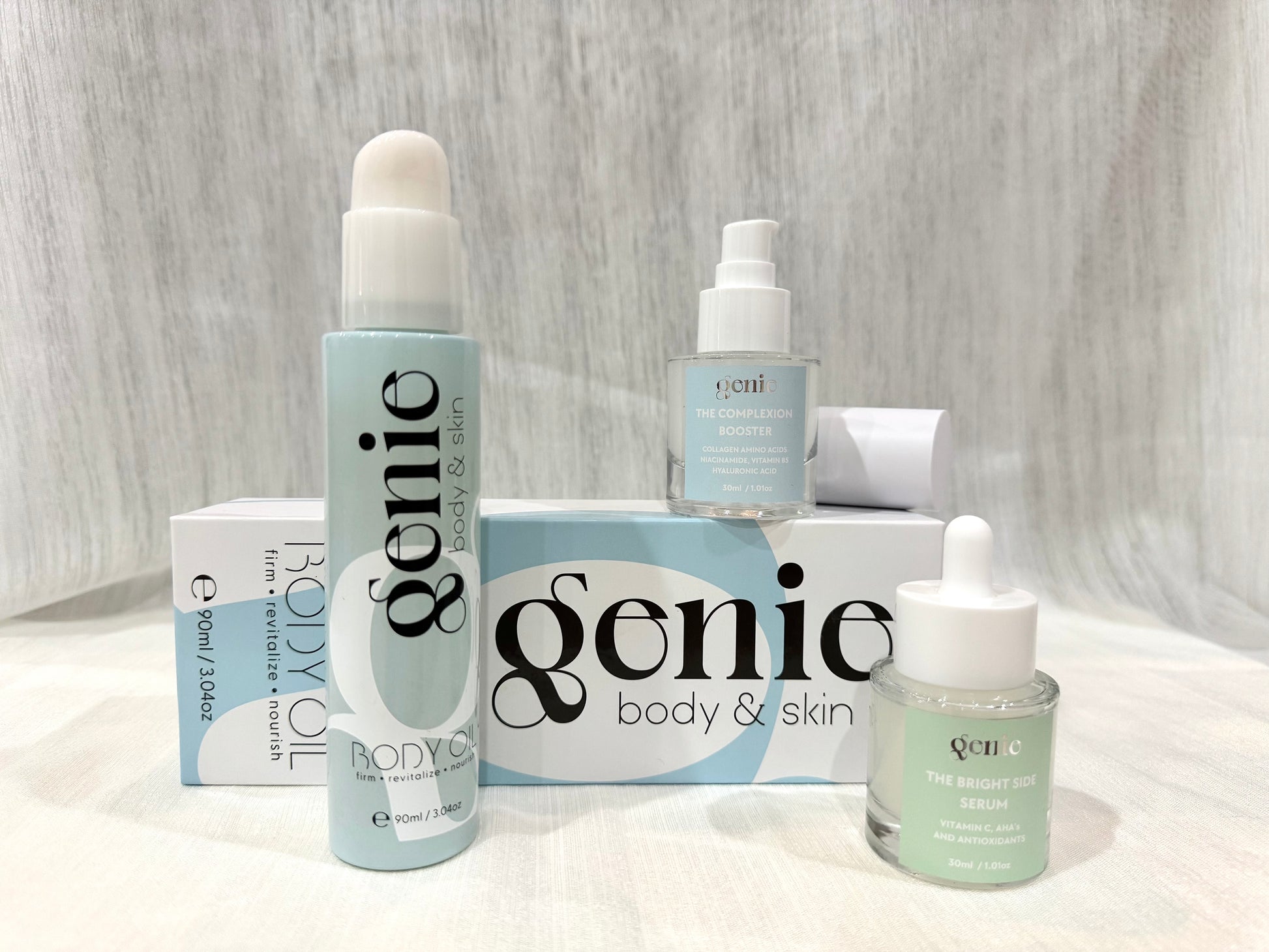 Serum, Complexion Booster, and Body Oil. Each product designed to play beautifully alone, but
