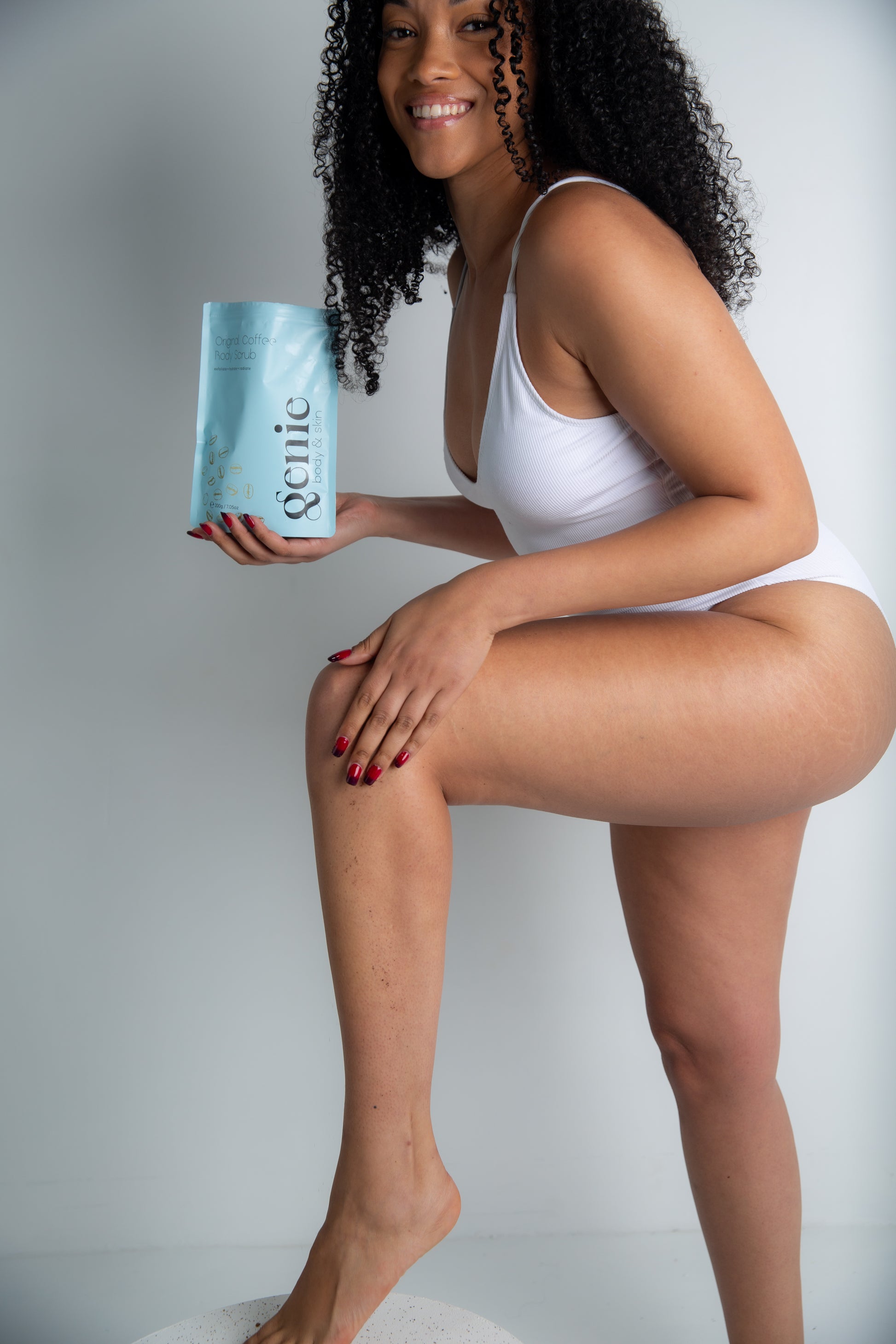 Start with the Coffee Scrub –your skin’s caffeine-loaded wake-up call. It buffs away bumps,